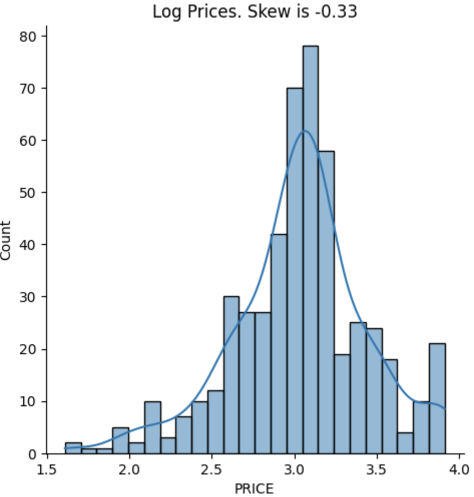 If we plot the log of the prices on a histogram, we get a skew of -0.33, or about a third of the skew for normal prices.