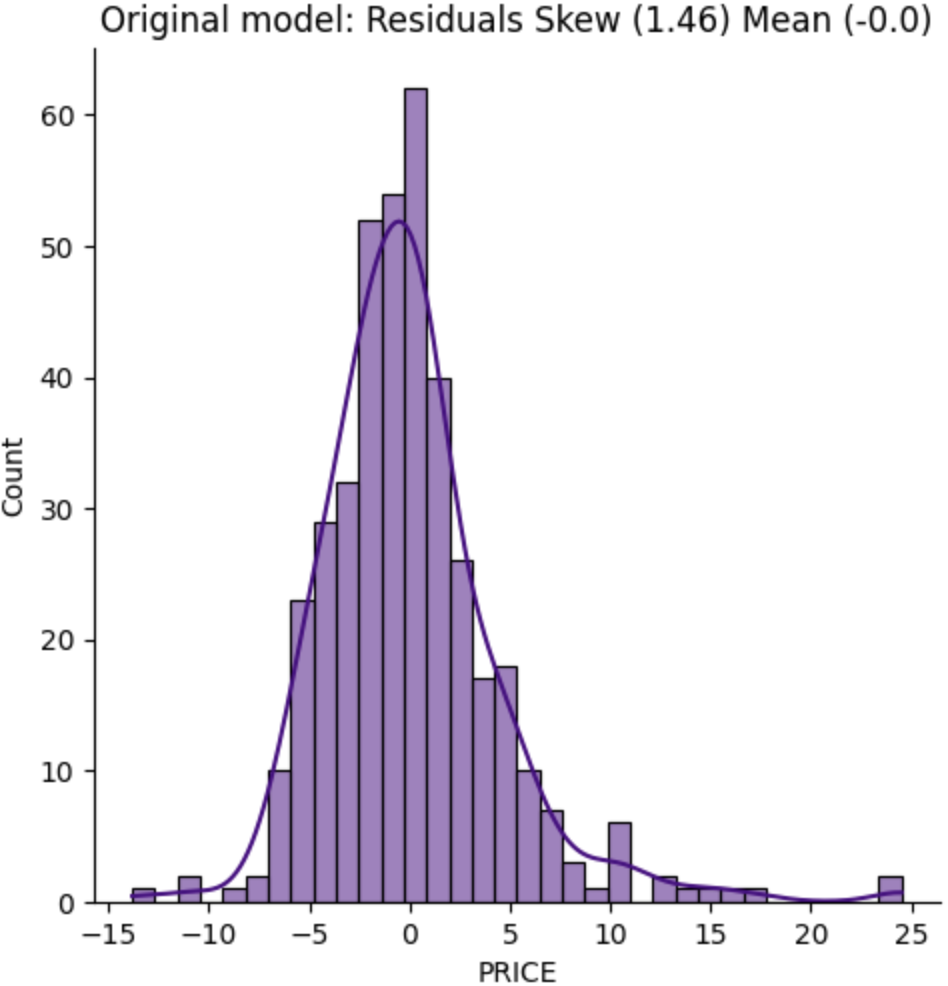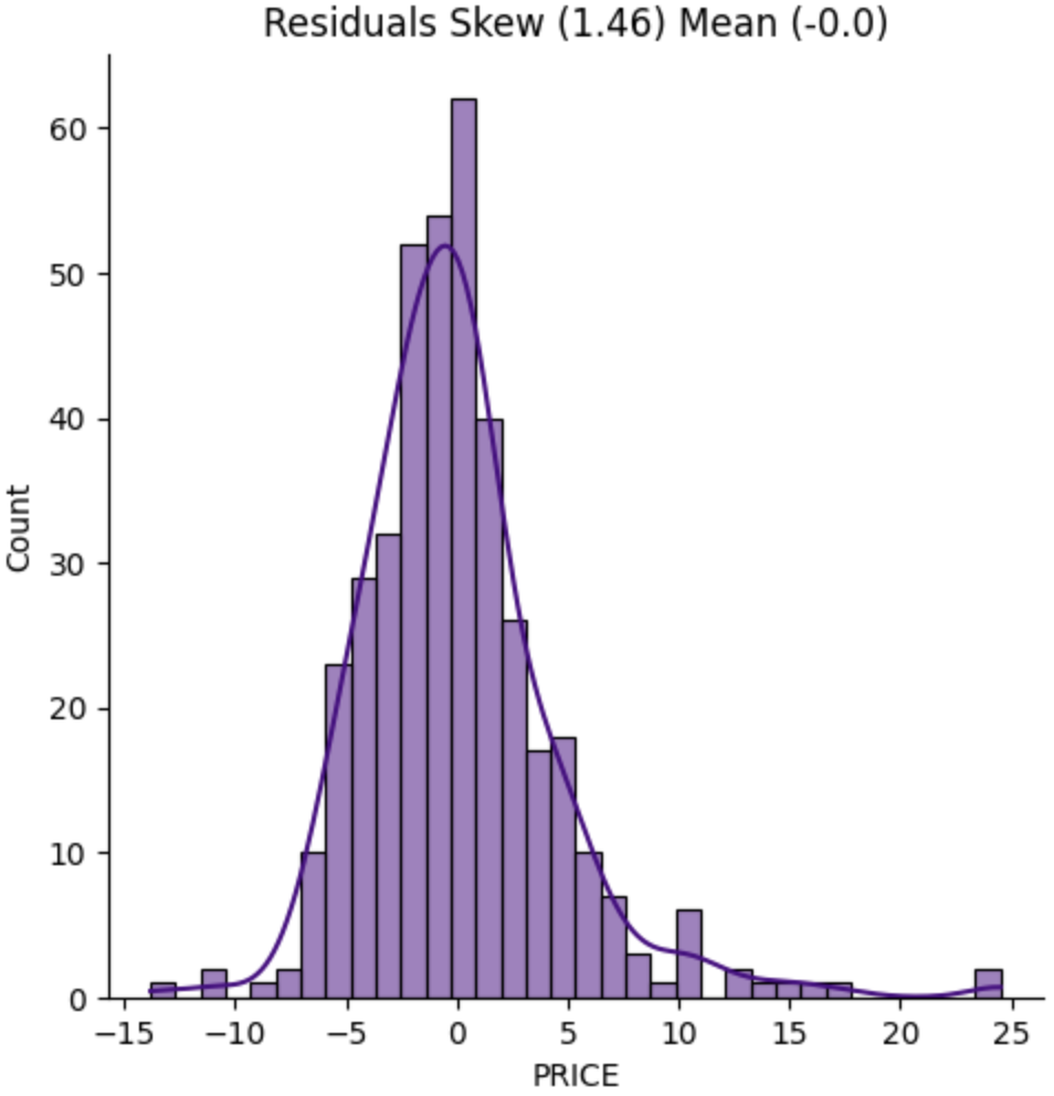 When looking at the skew of the residuals, we ideally want to see a normal distribution, a skewness and mean of 0. A skewness of 0 means the distribution is symmetrical, not biased in either direction. In our case we have a result of 1.46, and perhaps we could transform our data to get a better result.