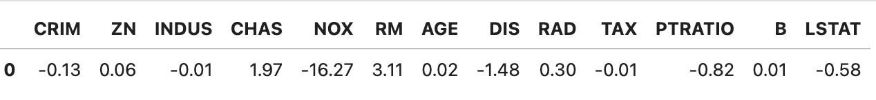 We can do a sanity check here, to see if the coefficients are what we might expect. Those coefficients with negative values would be indicative of an area with cheaper housing: higher crime-rate, more pollution in the air, a higher pupil-to-teacher ratio in schools. From looking, it appears that our coefficients are what we might expect at this point.