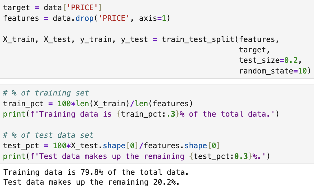 In order to train a model which can predict house prices for us, we need to split our data into testing and training sets, each with the 'features': those metrics by which we get the 'target' value. In this case the target value is the price, so the features will be all over values, i.e. CRIM, RM, TAX, etc.